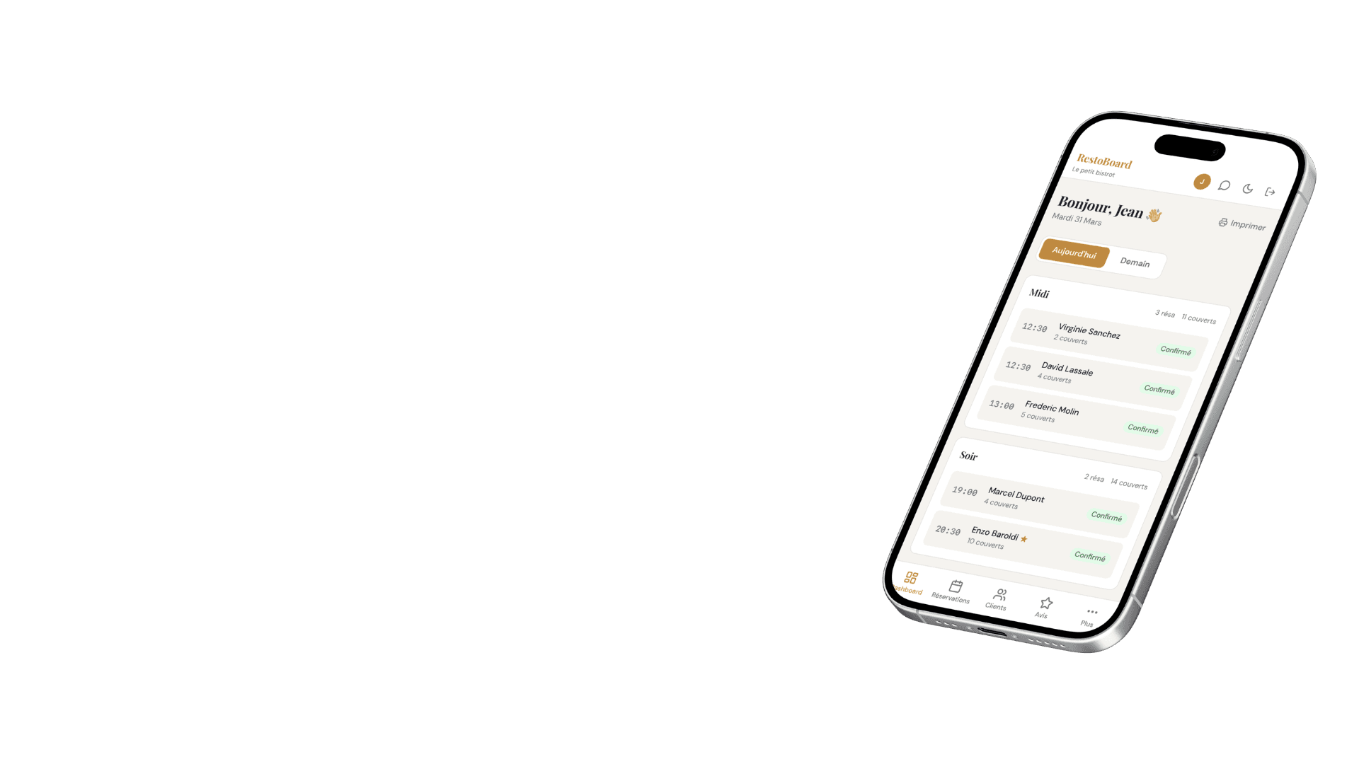 Gérez vos réservations depuis votre téléphone, en salle, en cuisine ou même depuis chez vous. RestoBoard s'adapte à tous les écrans.